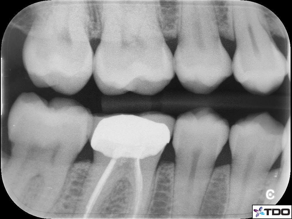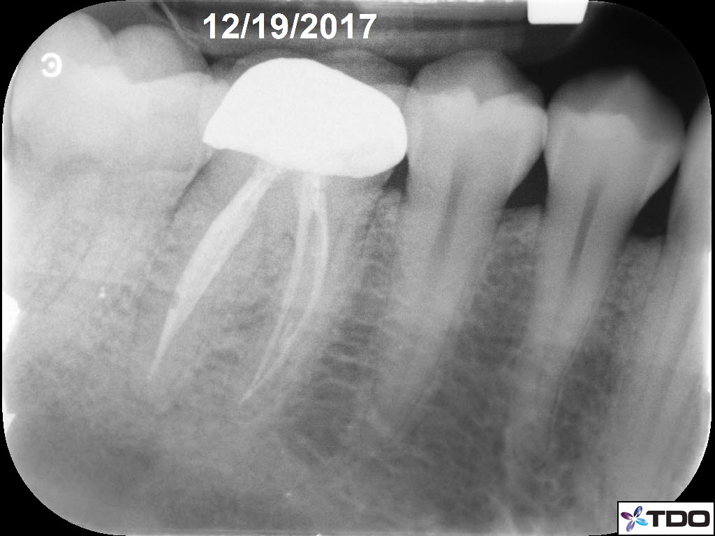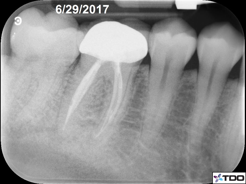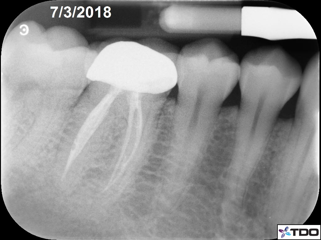In the hierarchy of dentin conservation the existing restorative has the lowest priority and it quite frankly gets in the way of our access to the root canal system. But, after practicing directed dentin conservation for a while, you sometimes get lucky. The patient is 40yo. She was symptomatic at the time of treatment and interestingly the mesiobuccal canal was partially vital while the mesiolingual, distobuccal and distolingual canals were partially necrotic. She was asymptomatic at the completion visit as well as at the follow-up appointments.