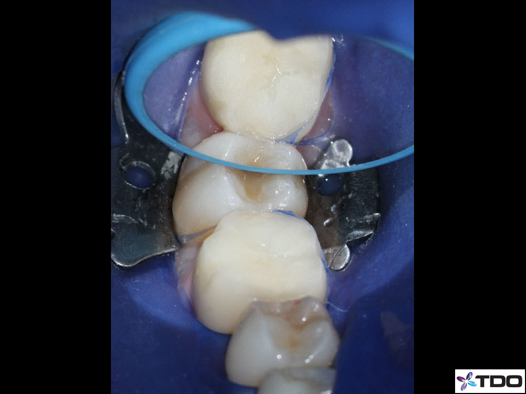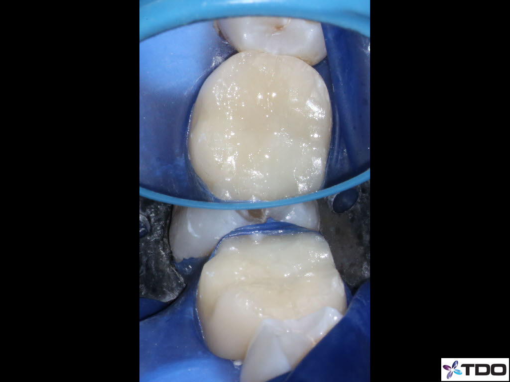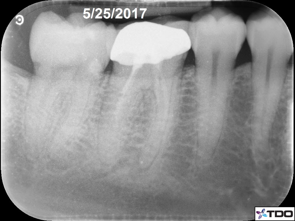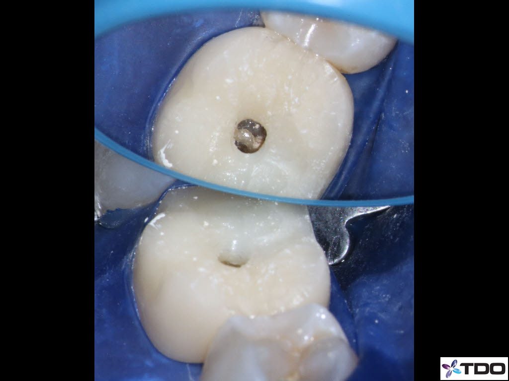 In the hierarchy of dentin conservation the existing restorative has the lowest priority and it quite frankly gets in the way of our access to the root canal system. But, after practicing directed dentin conservation for a while, you sometimes get lucky. The patient is 40yo. She was symptomatic at the time of treatment and interestingly the mesiobuccal canal was partially vital while the mesiolingual, distobuccal and distolingual canals were partially necrotic. She was asymptomatic at the completion visit as well as at the follow-up appointments.