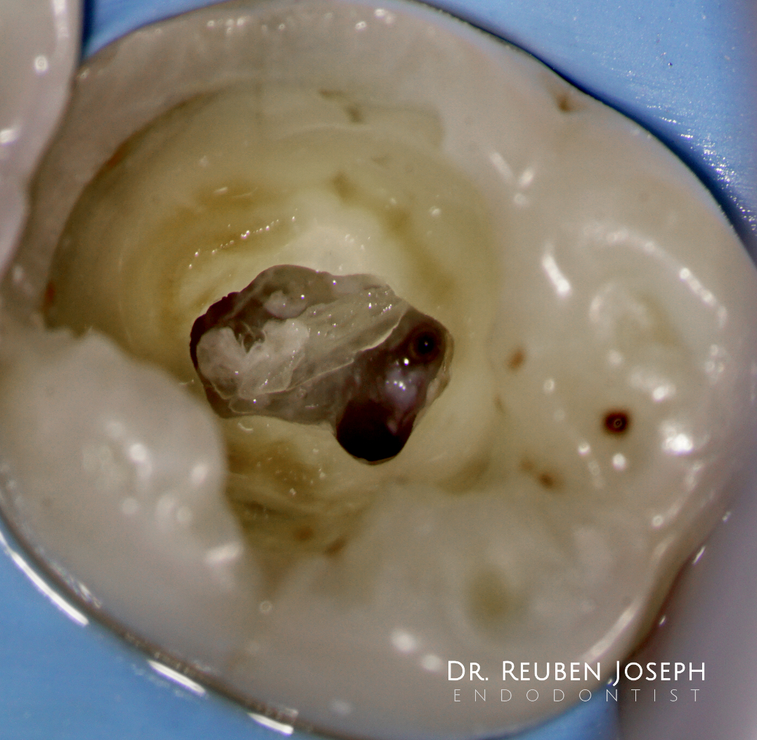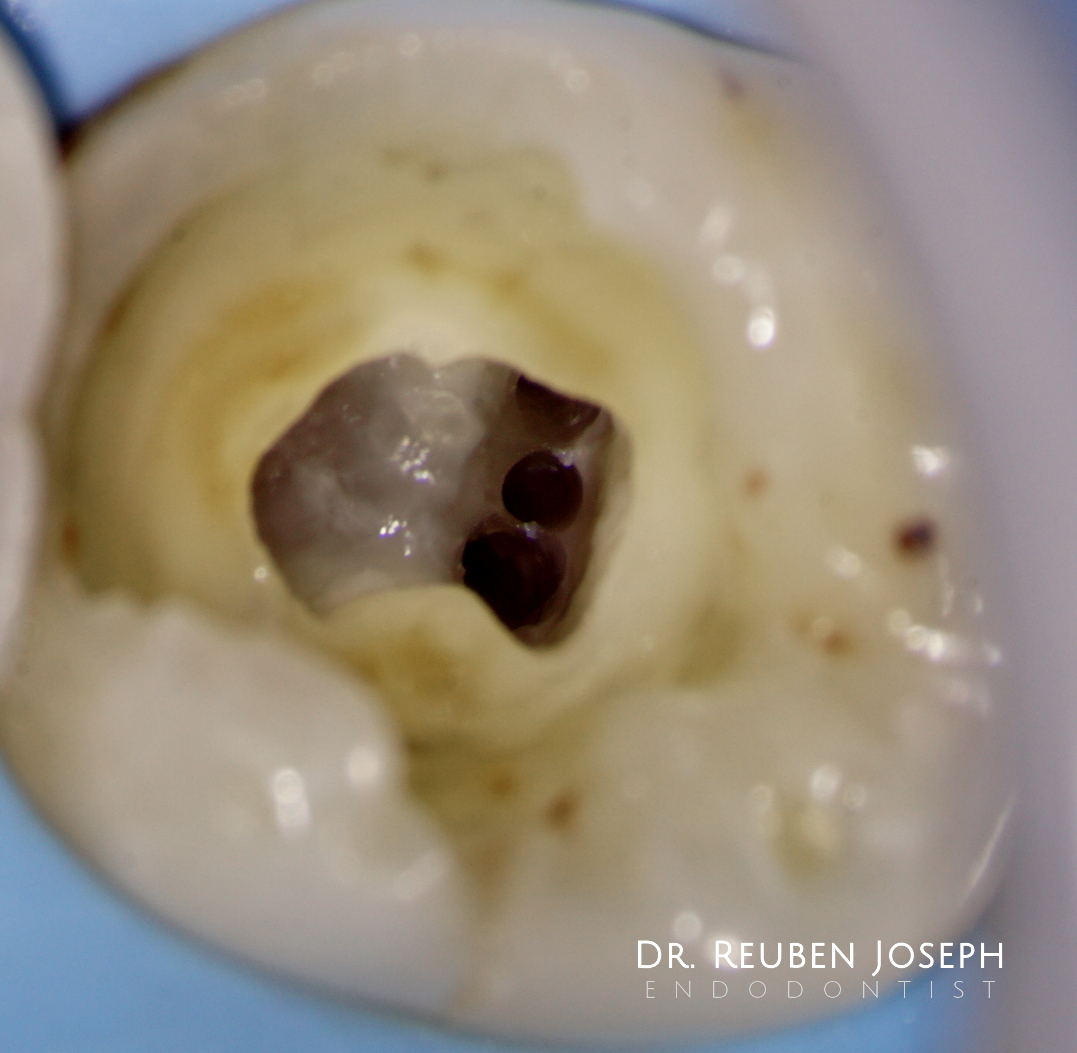 Shaped to 4% 25 in all canals except MM – 5%15. Obturated using WVC. Could have been a lot more conservative in the access prep but staying within ones comfort-zone (which can also be stretched as and when needed)is also important in these cases to achieve the intended therapeutic goal.