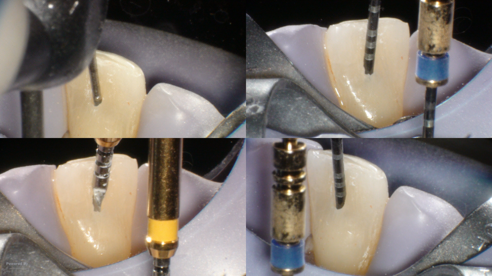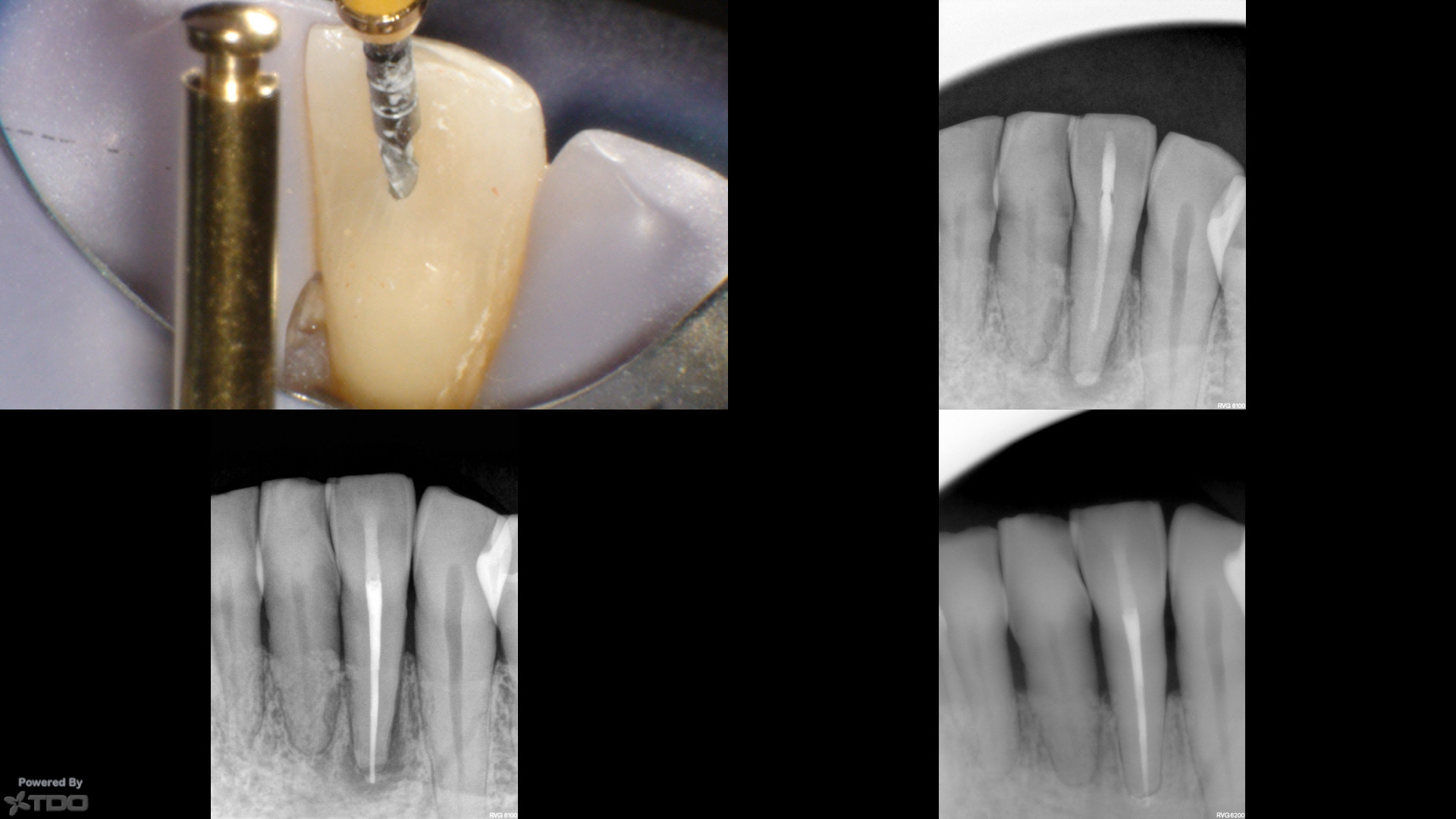 Clinicals show the access with an SS White EG-4 and a round bur which completely covers the access. File clinicials show a SSW 17/V.04 (white band) at length (20mm), am SSW 30/V.06 (blue band) (final shape) and a ProTaper (R) F1 (yellow band) that doesn't even fit in the completed access/shape.