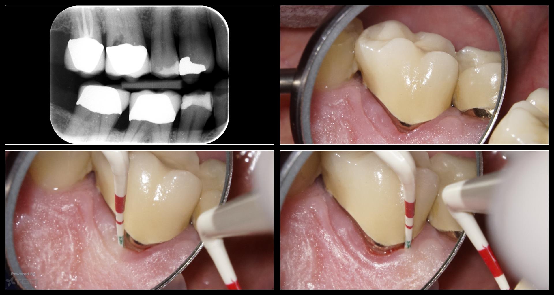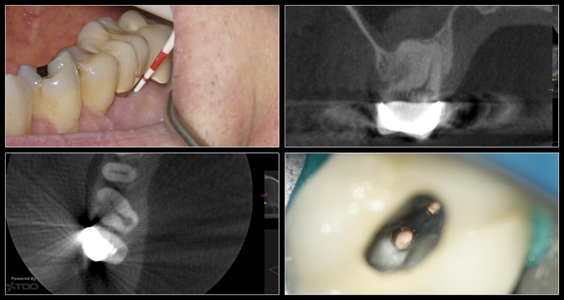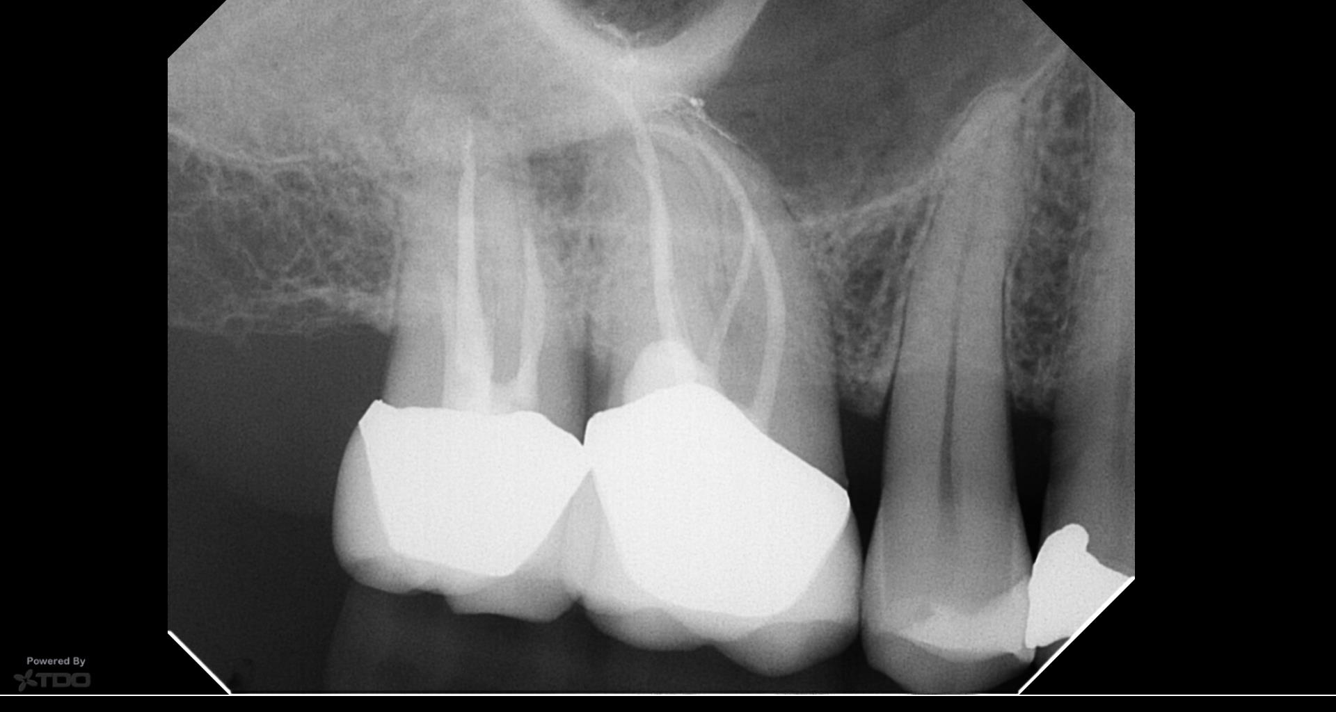 No apparent periodontal communication, treated internally. V-Tapers. Glass fibre post on the palatal canal