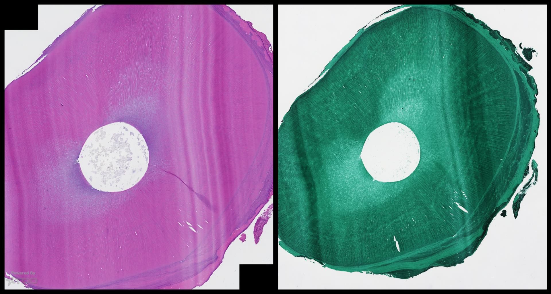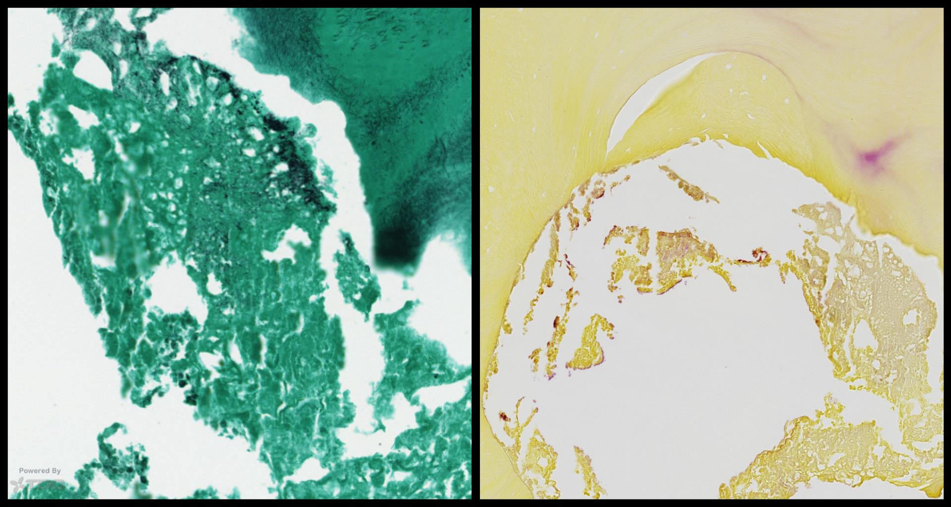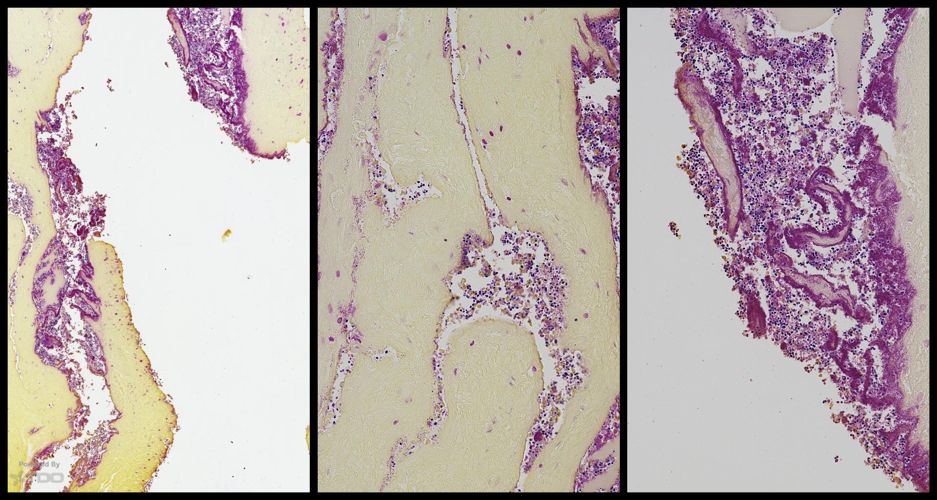 I took John’s root tip he sent me and processed it as follows: 1. Decalcified the root in EDTA for 1 week then some Decal overnight (Formic aa) 2. Mounted in parrafin for standad H&E staining. 3. Sectioned the tooth axially every 100 microns until exhaustion. 4. Every 100 microns an H&E stain was done, A Brown-Brenn stain was done, and a Fungal stain was done. 5. All 60 slides were scanned at 200x, and 600x. Two representative sections are shown here. Initial impressions: 1. No lateral canals were detected in any of the slices. 2. No bacterial colonization was detected in any of the B-B stained slides 3. There was a suggestion of fungal colonization on the external root surface 4. The pulpal space had minimal, if any, bacterial morphotypes evident. Open to alternative impresions from others. The last (page 7) slide shows the control slide for the Brown-Brenn bacterial stain. gbc Ain’t the Collage function awesome…..