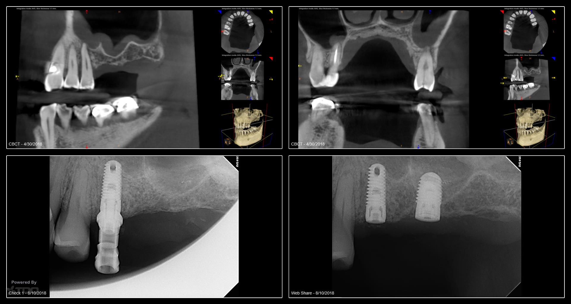I began seeing this patient in 2014. Tooth #14 was diagnosed with a vertical root fracture at that time and the tooth was removed and the site grafted. He then presented in 2015 with a VRF of #15. It was removed and we discussed an implant in the #14 site. He did not follow up with the implant. He presented earlier this year with a vertical root fracture of #13. The tooth was removed in April and implants were placed today. Internal sinus lifts were performed for both #’s 13 and 14. I will uncover in 4 months. We have also discussed the importance of a night guard. Hopefully he will follow through with the guard. -Charles