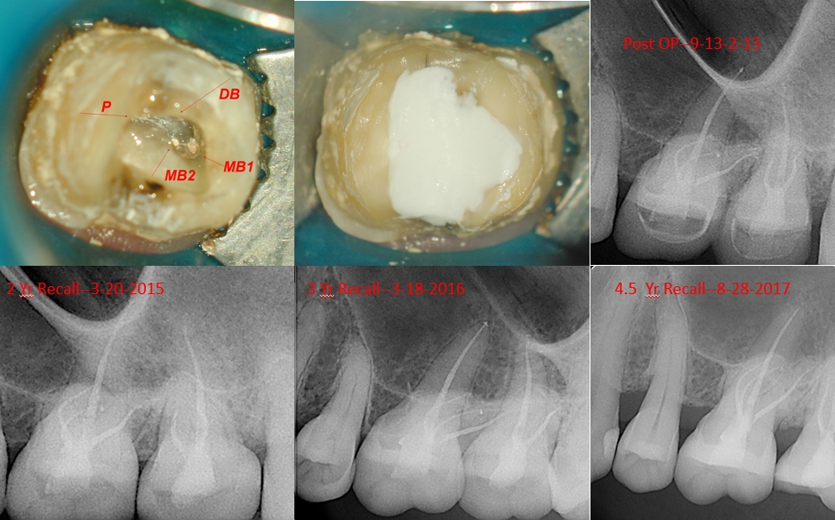 the buccal canals were shaped to a 17/.04 VTapers, and the palatal to a 20/.06 VTaper. I saw the patient for a 6MO Recall, a one year recall, and 2,3,4.5 year recall (she missed her 4 year recall) and I should be seeing her in a few months for her 5.5 year recall (I hope the tooth is still there and is still asympomatic).