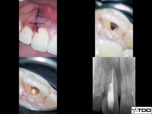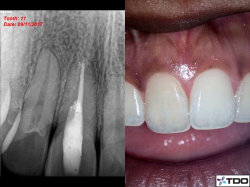 23 YF presented with pain and clinical signs of GP inside the buccal aspect of the gingiva around tooth #11 (FDI). The scan shows the buccal perforation with two GP points and an apical finding. Initially we removed all GP fragments internally and repaired the internal aspect of the perforation with SDR and interim CaOH was placed into the true canal. Second visit, the patient was asymptomatic and the surgical phase involved repairing the perforation defect with Geristore. The RCT was then completed and the access was closed with resin. Patient was very happy with the aesthetics at the follow-up and no- probing was evident at the perforation site through the buccal marginal gingiva. I hope this turns out well long-term.
