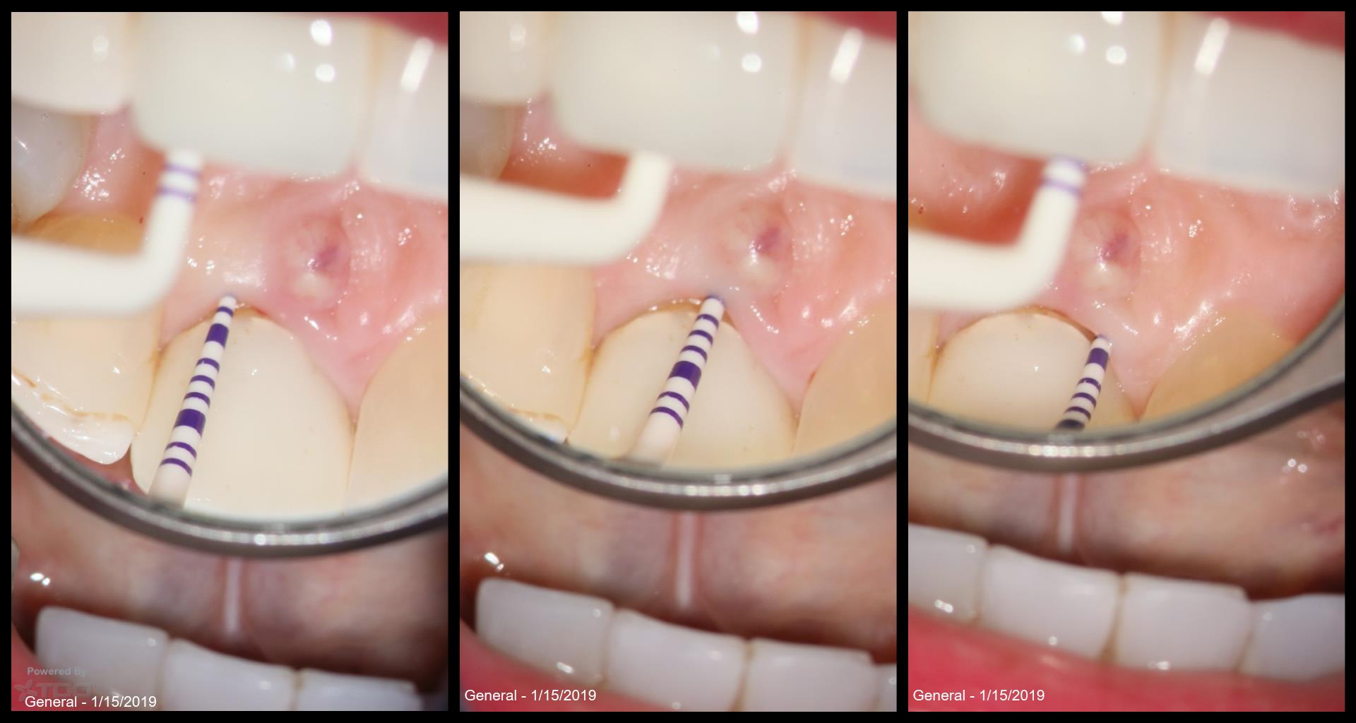 What is the treatment option being considered? Can you flap and repair? The lesion appears well-demarcated, without bone ingrowth, so it may be a simple repair with minimal ostectomy. If the patient can tolerate a couple black triangles (despite only flapping the palatal), then I might do it.